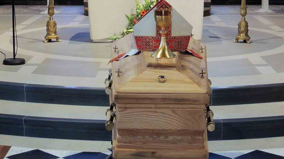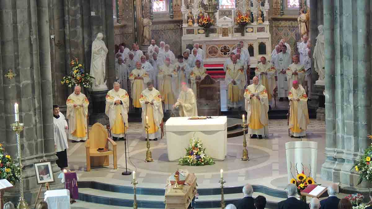 Preparations for Seamus’s funeral got underway and his body was received at St Mary’s Cathedral in Kilkenny on Wednesday night. The Rite of Reception was led by Bishop Denis Nulty (Apostolic Administrator of the Diocese of Ossory), who welcomed Bishop Freeman’s family: sisters Esther and Mary, brothers Tommy, John and Pat and their extended families. Bishop Nulty welcomed Archbishop Eamon Martin (Archbishop of Armagh and Primate of All Ireland) who joined priests and religious from Ossory, members of the Pallottine Society and parishioners from various parishes of the diocese. He spoke of the three families of Bishop Freeman: The Freeman Family, The Pallottine Family and The Ossory family. Sacred music was provided by the Cathedral Choir under the direction of Mr John O’Neill. Housekeepers at Bishop Freeman’s house Mary Ryan and Bernadette Hunt and Painter and Decorator of the Cathedral Vincent O’Brien placed the bishop’s mitre, the bible and cross upon the coffin. Fr Donal McCarthy, SAC, a long time friend and co-worker with Bishop Freeman gave the reflection. The Prayer of Intercession was led by Rita Neary, Parish Secretary in St Mary’s Parish. At the end of the ceremony Fr Richard Scriven, Administrator of St Mary’s Cathedral, invited all to a cup of tea in the Chapter Room and to Night Prayer in the Cathedral at 9.30pm.