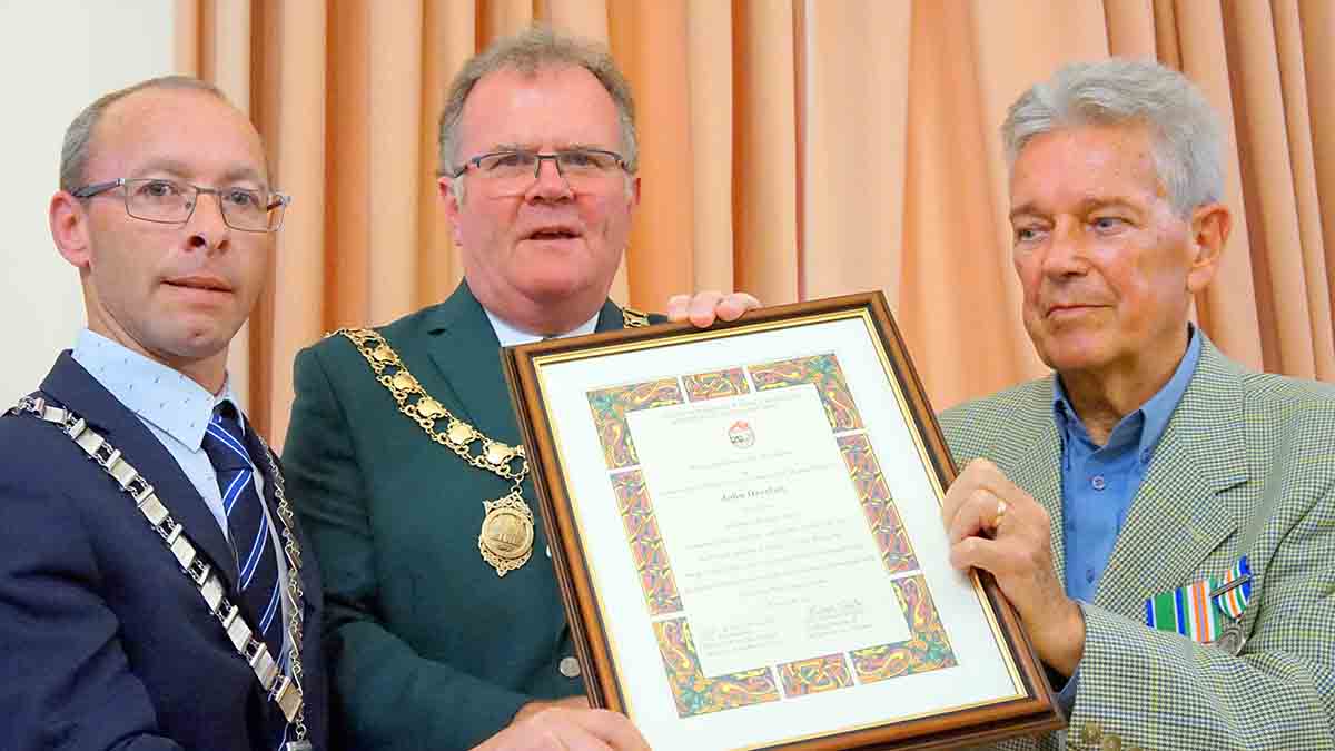 Chair of Kilkenny County Council Michael Doyle and Mayor Joe Malone present a certificate to John Dreelan (who was a medic at Jadotville 1961) at City hall, Kilkenny. Photo: Pat Shortall