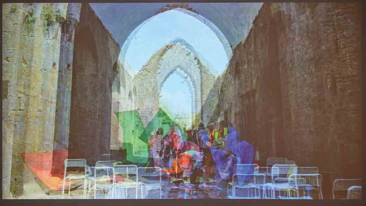 In ‘Priory’ the artist uses the ruin of Callan Augustinian Priory to stage rehearsals, creating a multi-layered, filmic, almost hologrammatic atmosphere. A transmutation of energies occurs, boundaries collapse and unexpected connections occur. An official makes a speech only to be disrupted by his audience. The passive audience become active participants; all energies, material or immaterial, combine in riotous colour only for the carpet to ultimately get rolled up as the shadow of the building shifts and ‘reality’ returns.