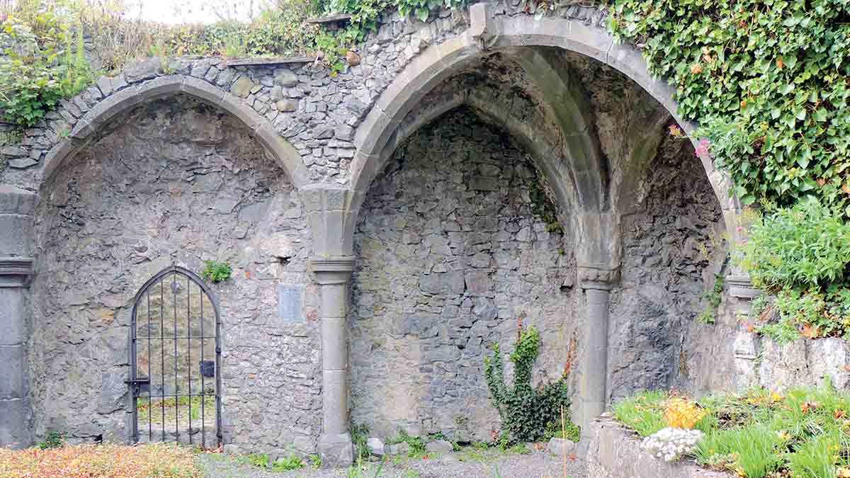 It was decided in 1800 to restore the old church for use as a place of worship. William Roberson was selected as architect and sent in plans, but these were rejected due to cost. The Lady Chapel was reroofed in 1817for use as a Protestant parish church. William Robertson was involved in much work in the city, including the re building of the Court House early in the 19th Century. According to Parliamentary Papers of 1808 he was paid £28- 14s -4d for work on the new Kilkenny Gaol. On December 12th 1832 he bought part of the old priory known as Priors Orchard. He died in May 1850 and was buried in St Mary’s graveyard. His altar tomb bears an incomplete inscription. The few details gleaned were his name and that he was Mayor of Kilkenny, 1831- 1832. William’s wife survived him by over twenty years. She died on 26th January 1872 aged 86 years.