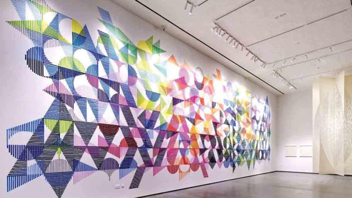 His present exhibition at the Butler Gallery includes a gigantic mural, titled Parallels, that covers an entire wall…a visually stunning collage of interacting colour and lines that have an almost living vibrancy.