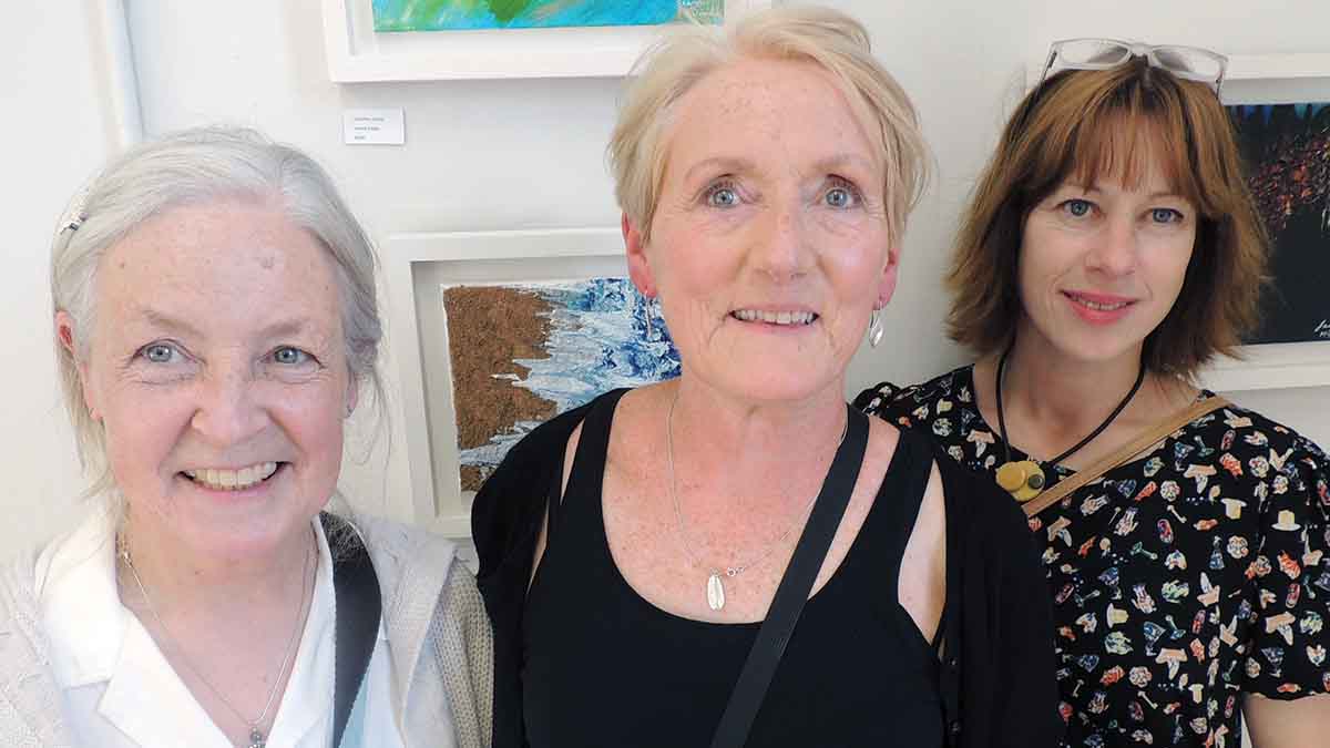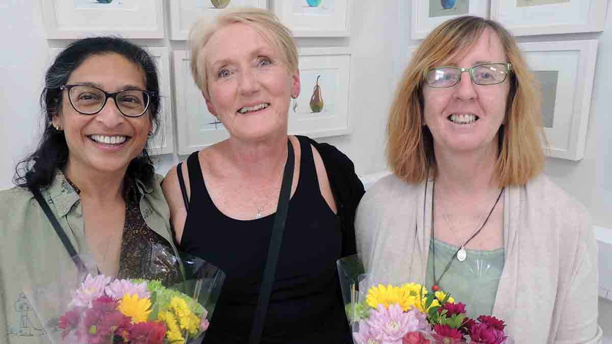 Susan Fahy of T.A.S.K presented a bouquet of flowers to artists Jeanie McDonald and Tia Vallani at the launch of their exhibition at the Auxiliary hospital