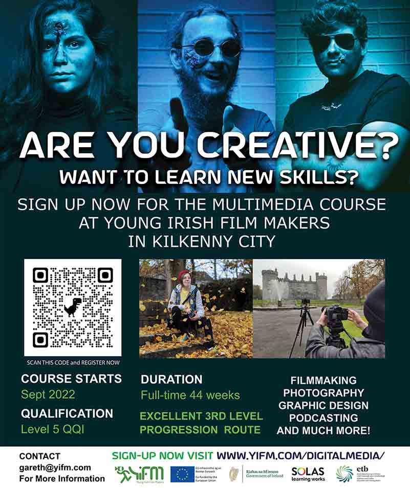 The Kilkenny City based course runs full time for 44 weeks and begins in September 2021. The course is a full time foundation in all things media. Every September, 20 creative people aged 16+, sign up for 44 weeks of video production, music production, podcasting, photography, graphic design, performance and video editing.